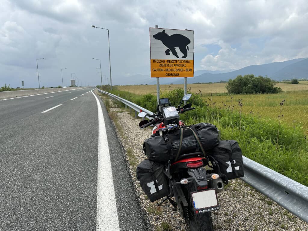 De eerste kilometer in Griekenland denk ik even dat we een verkeerde afrit hebben genomen en we in Canada zijn terecht gekomen, want er staan grote borden naast de weg, die waarschuwen voor overstekende beren.